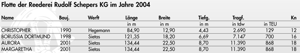 2004 Kapitän Rudolf Schepers bereedert zurzeit drei moderne Containerschiffe und einen Mehrzweckfrachter, die nach den neusten Anforderungen des Transportwesens konzipiert wurden und sich weltweit einsetzen lassen. Dabei legt er in seinem Familienbetrieb großen Wert auf die persönliche Betreuung der Schiffe. Die Schiffe fahren insbesondere für die 1995 gegründete „ESF Euroservices“, die mit ihren Frachtschiffen gezielt einen Containerfeederdienst zwischen den Hafenmetropolen Westeuropas und den nordeuropäischen, baltischen und russischen Häfen unterhält. In Planung befinden sich zwei weitere Neubauten (18.000 tdw, 1200 TEU mit der größten Eisklasse E3), für die bereits langfristige Charterverträge abgeschlossen wurden.