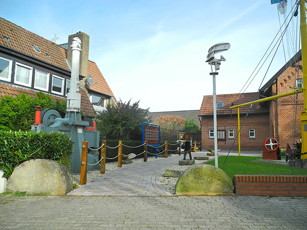 Die Museumsanlage bildet den zentralen Punkt unserer „Maritimen Meile“. Es geht zunächst an den Museumsschiffen entlang, danach zurück zum Gebäude, vor dem links ein Schild mit den Tafeln der Harener Reedereien steht. Ein kleiner Weg führt uns dann hinter das Museumshaus, wo wir eine Vielzahl von „Steinen“ finden und einen Platz zum Verweilen.