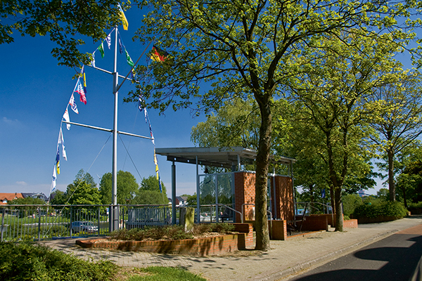 Die Signalstation wird auch „Schifferruh“ genannt. Der Mast mit den Flaggen Harener Reedereien grüßt die auf der Ems vorbeifahrenden Boote und Schiffe. Auf den hier eingelassenen Tafeln finden sich die Namen der Fahrensleute, die in Ausübung ihres Berufes gestorben sind und die Schiffsverluste, die Haren zu beklagen hatte.